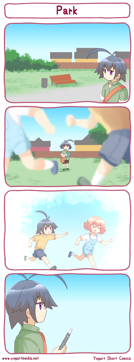 Hi everyone! It’s a new week and I have a new comic to share! Spring is here and things are starting to warm up nicely. To kind of celebrate the coming of spring, I have been working on a special silent comic chapter with Berry, focusing more on his character and pursuits. Here, Berry is going for a walk around the neighbourhood in hopes of getting inspiration for his manuscript. He notices several children playing in the local park and playground. He is reminded of the time when he was younger and playing together with Yogurt. Of course back then, his relationship with Yogurt was much different than what it’s like now, but he is still fond of the memories he had made.